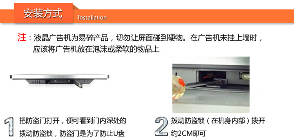 控制方式 | 通過U盤,SD卡播放播放 | 通過U盤,SD卡更新節目,直接將內容導入機器內存,(內置4G 內存)優點:客戶無需另配內存卡;拷貝速度快 | 通過電腦用網絡(支持有線,wifi,可選3G)連接廣告機,電腦后臺統一遠程控制、管理 |