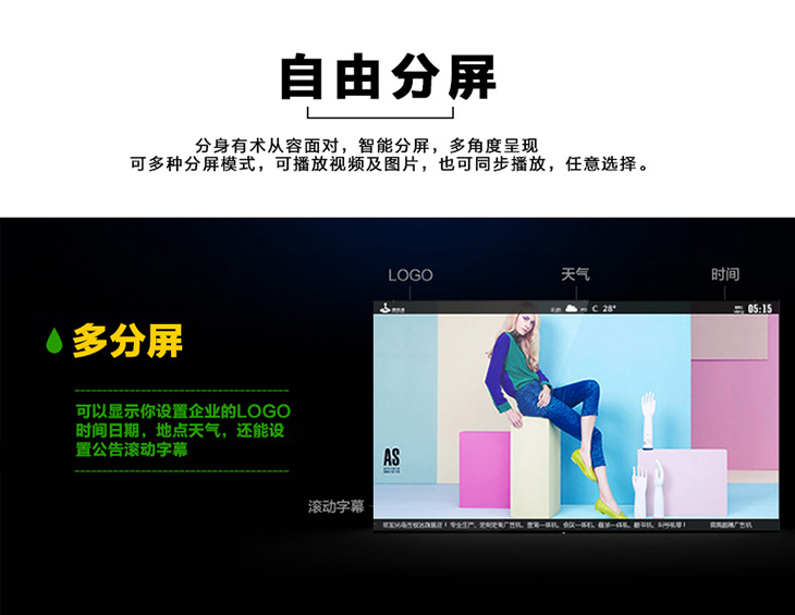 6、分屏功能:可以將圖片+視頻+滾動字幕同時多畫面顯示,這樣獨特的顯示給廣告運營商帶來更多商機,可實現多家媒體的廣告同時播放。