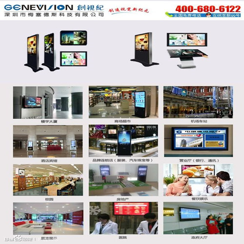 現在廣告機在公交車、長途汽車、出租車、酒店、飯店、銀行、學校、購物中心、汽車站、火車站、地鐵站、地鐵列車、高速列車、醫院、專賣店、售樓中心、展覽館、體育場、博物館等公共領域都隨處可見,為人們的生活更添一份色彩!