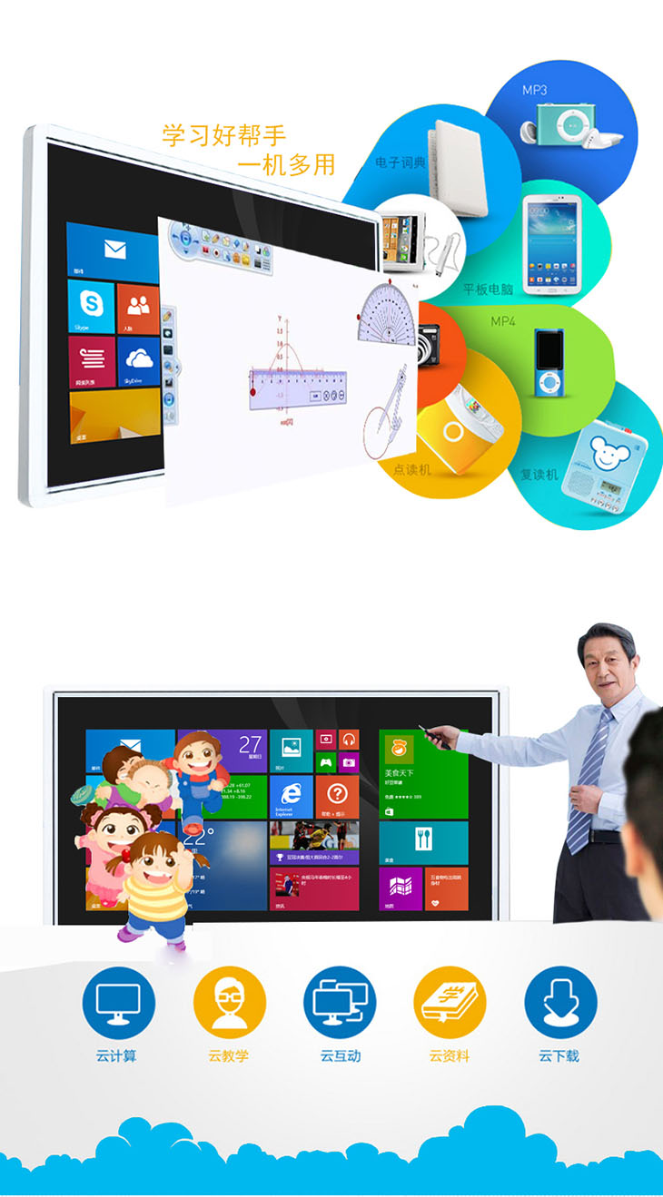其還具有4K分辨率,畫質細膩,細節更清晰;濾藍光和減少閃屏技術讓學生和老師的觀感更舒適;支持多點紅外觸控,讓老師更好的操控各種功能,并可以讓多個學生一同板書;配合內置Qtouch白板軟件,讓學習更具樂趣,即時更新海量課件資源,老師可以獲取更多知識點課件,內容常換常新。