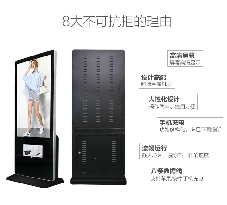 隨著當今社會的發展,手機是人們不可缺少的通信和社交的電子產品,現創視紀推出一款立式有線充電廣告機,支持多種型號手機接口充電(蘋果、安卓、華為),共有8條數據線,可同時充電,無需等待,操作簡單,使用方便,給外出者臨時充電的提供了便捷的服務,廣告機圖片和視頻可自主更換,高清顯示,廠家直銷,尺寸均可定制,歡迎前來選購