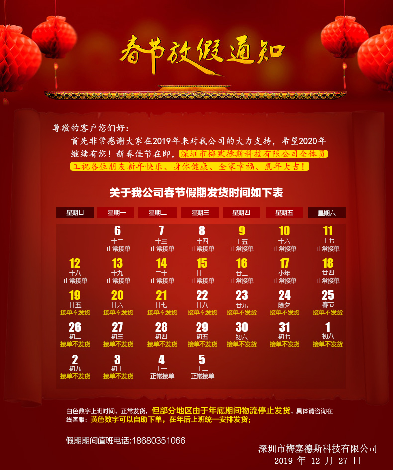 梅塞德斯科技春節放假通知出來了,祝大家新年快樂,身體健康,生意興隆!