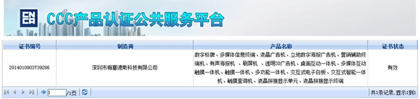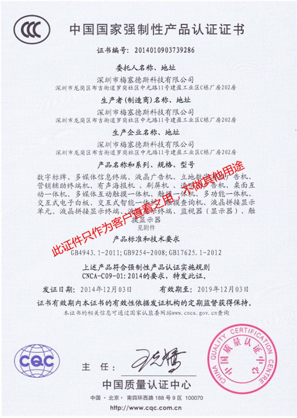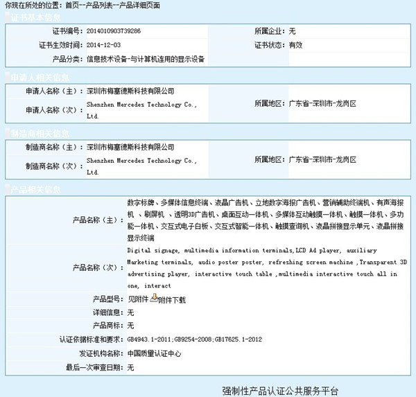 深圳市梅塞德斯科技--創視紀廣告機獲得國家3C認證